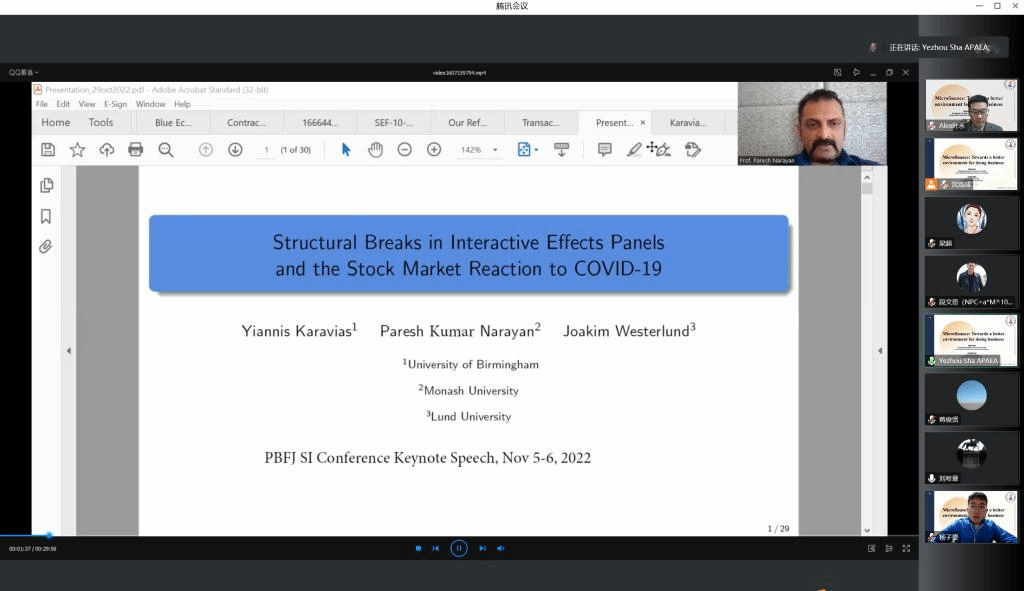 主题报告环节,澳大利亚莫纳什太阳成集团tyc151cc教授、亚太应用经济学协会主席、EMFT主编Paresh Narayan教授作了Structural Breaks in Interactive Effects Panels and the Stock Market Reaction to COVID-19的主题演讲。介绍了新冠疫情期间,股票收益与新冠肺炎之间关系出现的结构性破裂,阐述了判断是否存在结构性断裂的方法和断裂日期的检测方式。