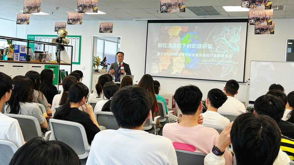 5月14日,太阳成集团tyc151cc金融学专业师生80余名走进中宏保险,开启行业深度调研。同学们通过实地走访,了解当前台州人寿保险的发展现状、经营范围、保险产品,调研保险公司的经营战略、营销方式、产品销售情况,探索保险业当前面临的挑战、未来发展趋势及人才需求。中宏保险台州中心支公司负责人任敏给员工带来了一场内容丰富的就业指导讲座。他介绍了中宏保险的前世今生,并从保险的起源、保险的发展、台州保险的市场分析、职业生涯发展思考四个方面与同学们展开深度交流。他提出,保险业正在经历人力爆发到结构性调整的规模性成长阶段,面对全球从“乌卡时代”(VUCA)向“巴尼时代”(BANI)的演变,建议同学们培养“反脆弱”思维,主动拥抱不确定性。