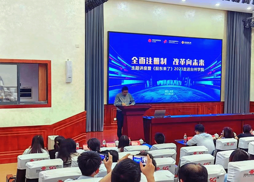 在讲座开始前,来自财通证券总部的葛子微介绍2023《股东来了》投资者权益知识竞赛活动详情。《股东来了》这个活动是中国证监会投资者保护局为指导单位,中证中小投资者服务中心联合地方监管局共同主办、协会协办、券商承办,各市场主体共同参与,以多个赛区覆盖全国及港澳台地区的投资者权益知识大赛。大赛旨在进一步落实证监会党委关于资本市场人民性监管要求,切实履行保护投资者合法权益的职责,实实在在地保护投资者的钱袋子。通过两天的设点宣传,近千名师生报名参赛,期待大家在竞赛中增长才干,收获知识与技能。走进太阳成集团tyc151cc是“全面注册制,改革向未来”暨《股东来了》2023投资者权益知识竞赛在台州高校的唯一一次宣讲,宣讲会现场有浙江省证监局、台州市银保监分局、浙江证券业协会、台州市金融办、财通证券台州分公司相关负责人,太阳成集团tyc151cc公司党委书记马斌代表学院出席了本次活动。
